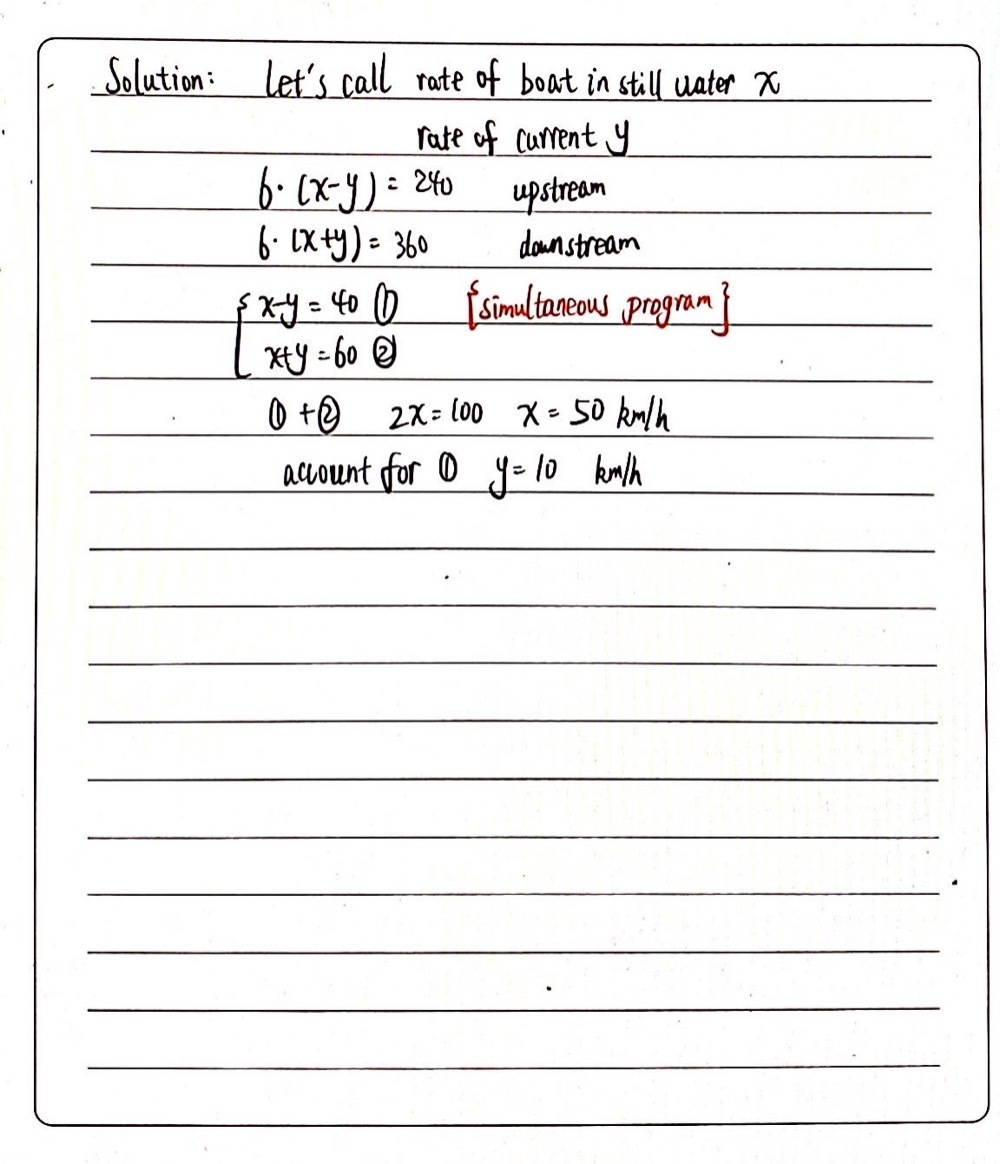 Algebra QA Library A motorboat travels 216km in 4 hours going upstream and 520km in 5 hours going downstream. What is the rate of the boat in still water and what is the rate of the current. S the speed of the stream.